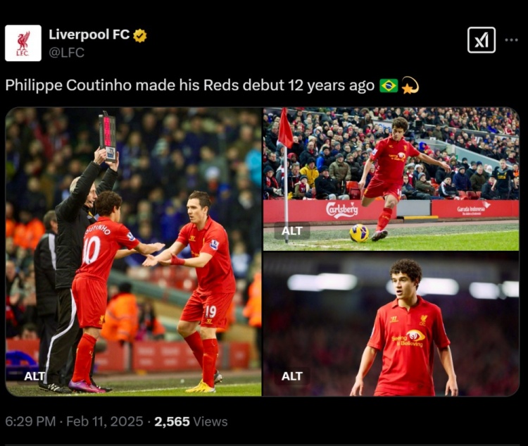 利物浦官方曬出庫鳥登場的照片,并寫道:12年前的今天,庫蒂尼奧迎來了他的紅軍生涯首秀!