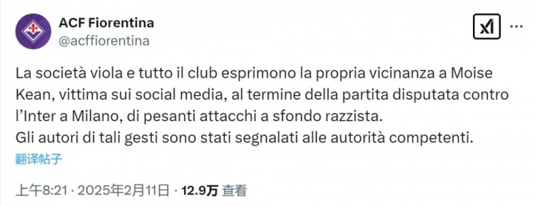 一些人在網(wǎng)上發(fā)布針對小基恩的種族主義內(nèi)容,對此佛羅倫薩官方發(fā)表聲明:“佛羅倫薩俱樂部對小基恩表示支持和慰問,客戰(zhàn)國米的比賽后他在社交媒體上遭到嚴重的種族主義攻擊。這些攻擊行為的實施者已經(jīng)被報告給相關(guān)當局?!?/p>