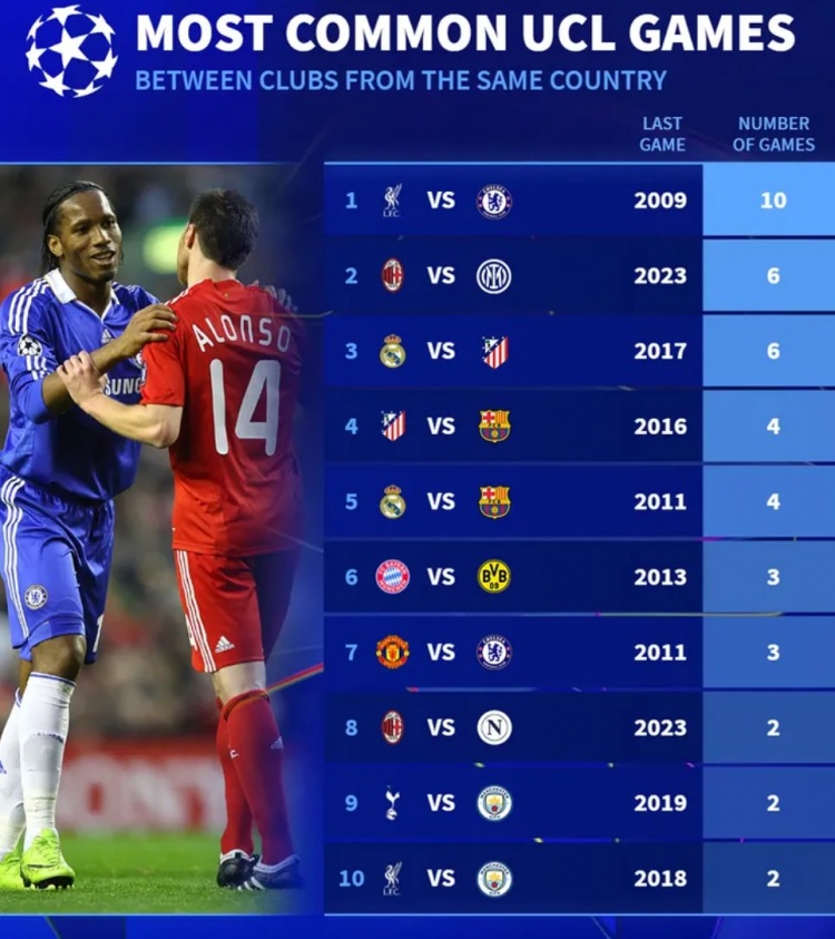 德轉(zhuǎn)列歐冠同國德比次數(shù)榜及上次交手時間: