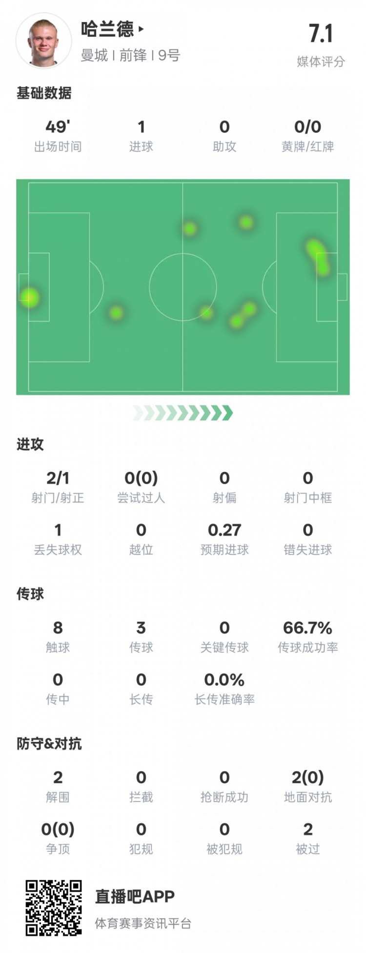 2月12日訊 歐冠淘汰賽附加賽首回合,曼城半場暫1-0領(lǐng)先皇馬。哈蘭德首發(fā)出戰(zhàn),打進(jìn)1粒進(jìn)球,半場評分7.1。