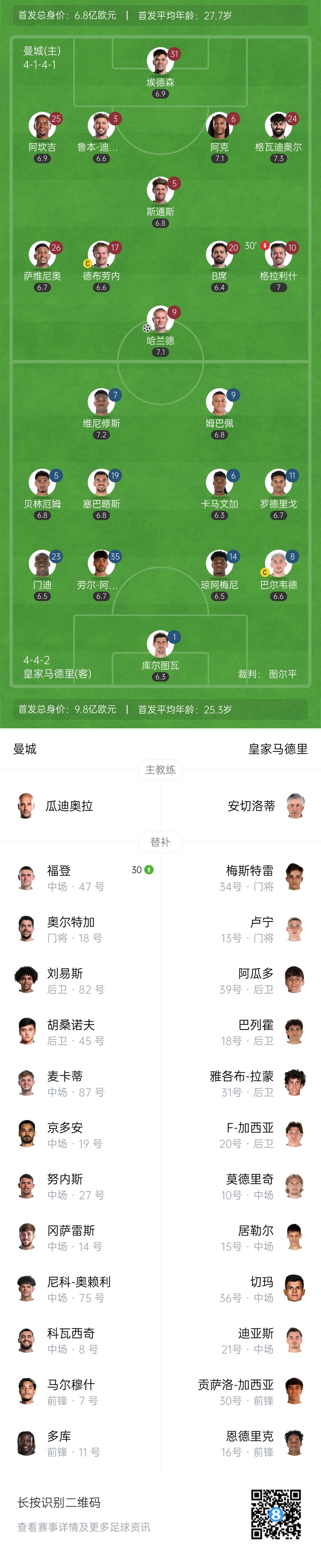 第19分鐘,格拉利什左路送出挑傳,格瓦迪奧爾胸部停球給哈蘭德,后者順勢推射得手,曼城1-0皇馬。↓