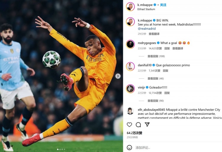 姆巴佩也在賽后通過社媒曬出自己射門瞬間的比賽照,并配文:“重要的勝利!下周主場再見,馬德里主義者們?。。。。皇馬俱樂部”。