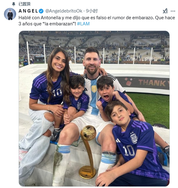 阿根廷媒體LAM記者Angel debrito在社媒辟謠寫道:我與安東內(nèi)拉進(jìn)行了交談,她告訴我懷孕傳聞是假的,他們已經(jīng)說了她懷孕的事3年了。
