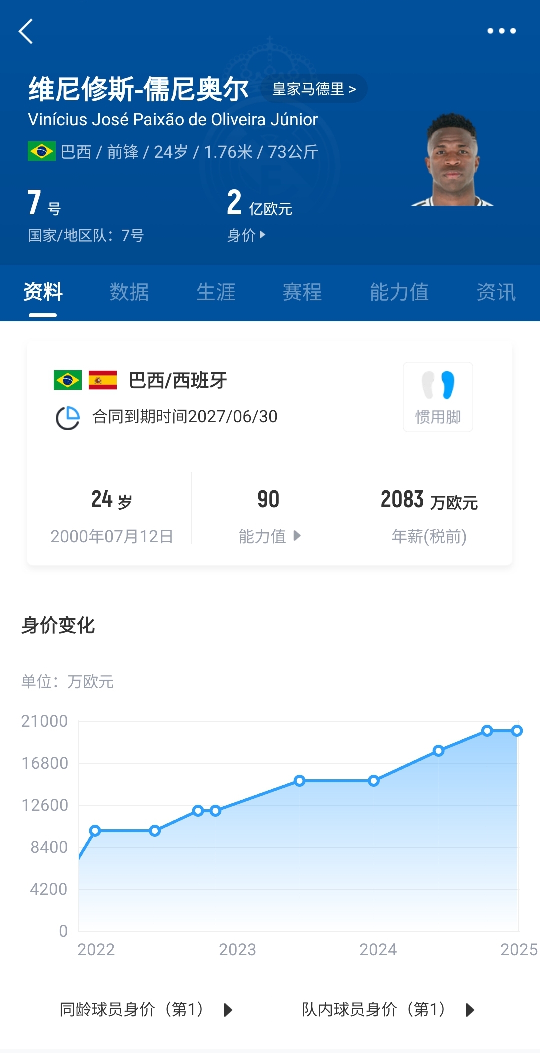 本賽季24歲的維尼修斯為皇馬出戰(zhàn)30場比賽,貢獻16球11助,目前球員德轉(zhuǎn)身價2億歐。