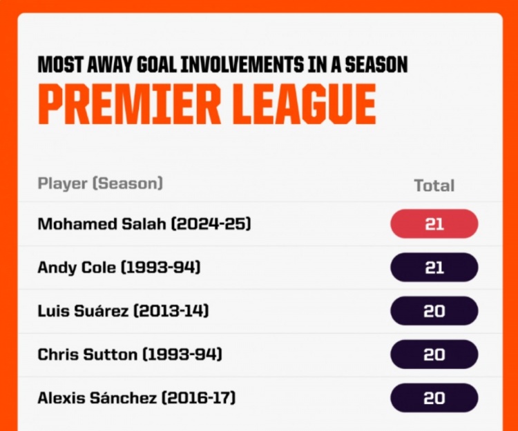 2月12日訊 Opta統(tǒng)計了球員單賽季在英超客場比賽中參與進球的數(shù)量,并列出榜單,本賽季薩拉赫參與21球(13球8助),與科爾并列排名首位。