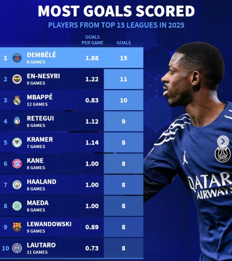 2月13日訊 《轉(zhuǎn)會(huì)市場(chǎng)》統(tǒng)計(jì)了2025年歐洲前15聯(lián)賽球員的各項(xiàng)賽事總進(jìn)球榜單,登貝萊領(lǐng)跑。
