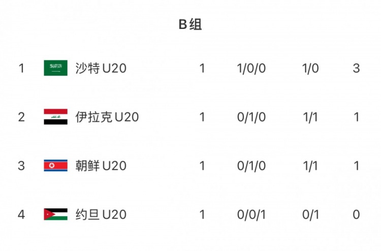 積分榜上,沙特3分領(lǐng)跑,伊拉克與朝鮮積1分,約旦0分墊底。第二輪賽事,沙特對(duì)陣伊拉克,朝鮮對(duì)陣約旦。