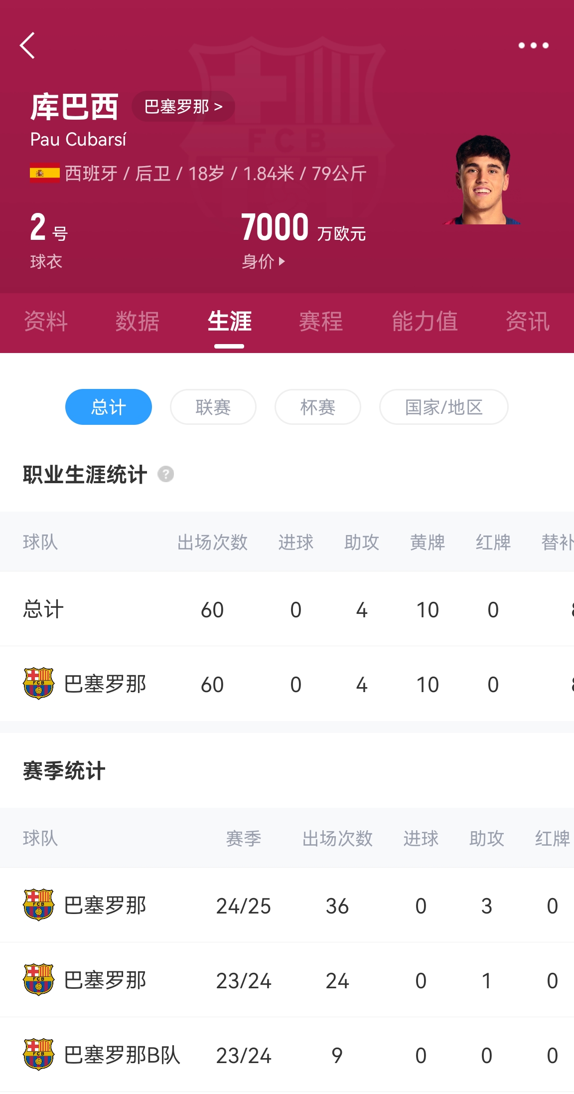 庫巴西是拉瑪西亞出品,在這個(gè)年紀(jì)已經(jīng)為巴薩成年隊(duì)出場了60次,他的身價(jià)已經(jīng)達(dá)到了7000萬歐元。