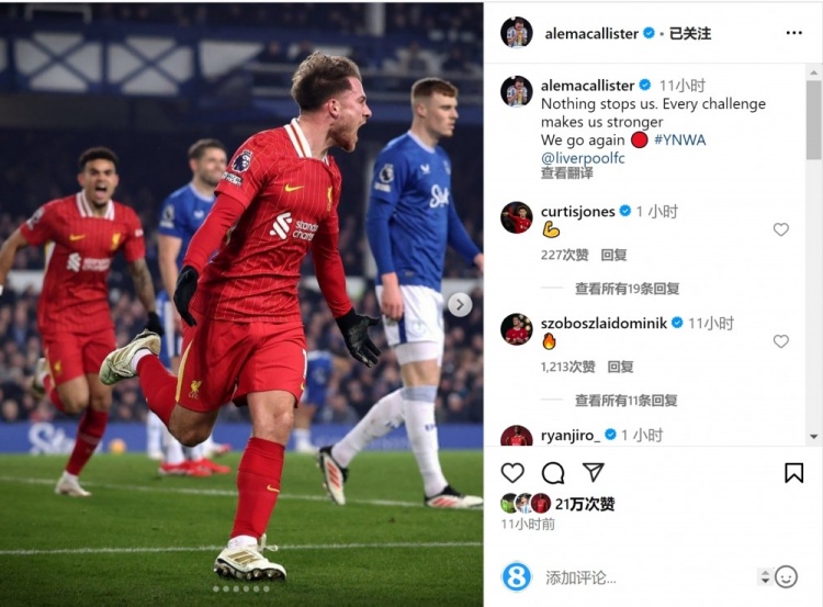 麥卡利斯特社媒曬出自己慶祝進(jìn)球的照片,配文:“沒有什么能阻擋我們,每一次挑戰(zhàn)都讓我們更加強(qiáng)大。我們再次出發(fā)?!?/p>