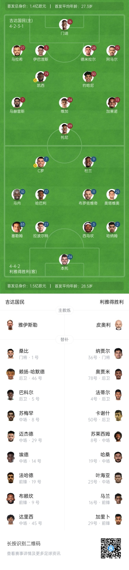 吉達(dá)國(guó)民首發(fā):16-愛(ài)德華-門迪、27-馬加希斯、3-伊巴涅斯、28-德米拉爾、15-阿馬爾、79-凱西、30-約哈尼、7-馬赫雷斯、24-加布里-維加、13-加萊諾、99-伊萬(wàn)-托尼