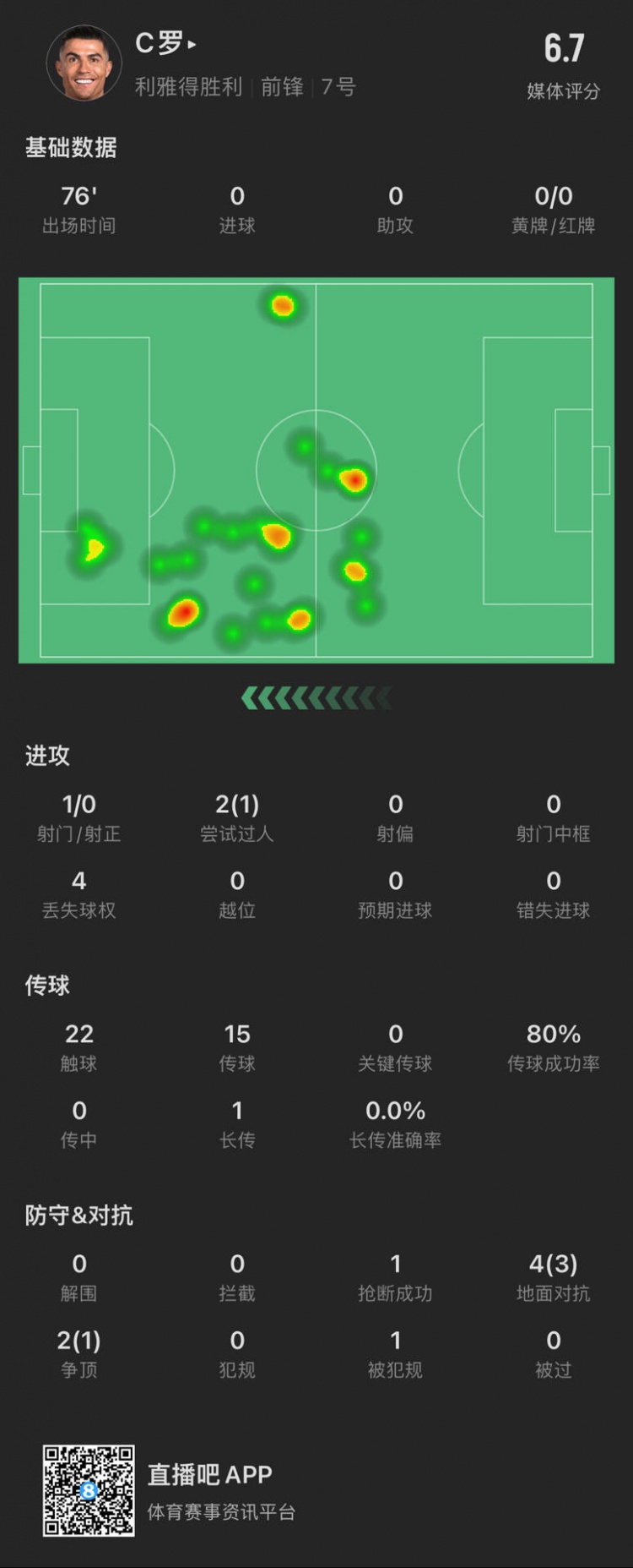 2月14日訊 沙特聯(lián)賽第20輪利雅得勝利對(duì)陣吉達(dá)國(guó)民的比賽正在進(jìn)行,C羅本場(chǎng)比賽首發(fā),第76分鐘被換下,以下是他本場(chǎng)比賽的數(shù)據(jù)。
