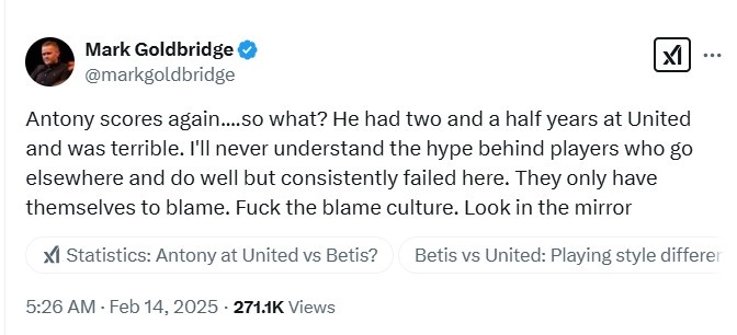 英國著名曼聯(lián)球迷頻道The United Stand的主理人Mark Goldbridge對此表示道:“安東尼又進(jìn)球了...那又怎么樣?他在曼聯(lián)待了2年半時間,表現(xiàn)很糟糕。我永遠(yuǎn)無法理解那些去其他地方表現(xiàn)很好的球員背后的炒作,不過他們總是在這里失敗。他們只能怪自己,去他*的責(zé)備文化,照照鏡子吧?!?/p>