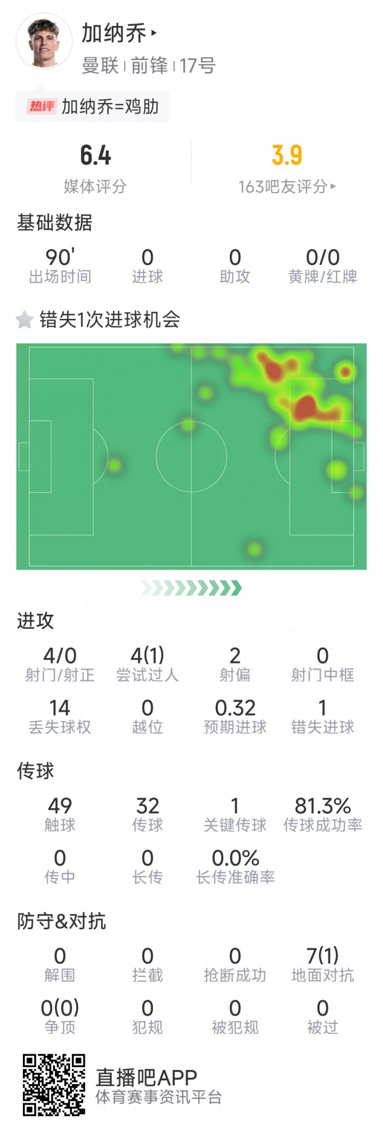 2月3日訊 在本輪英超,曼聯(lián)0-2不敵水晶宮。本場比賽加納喬發(fā)揮不佳,以下為他在本場數(shù)據(jù):