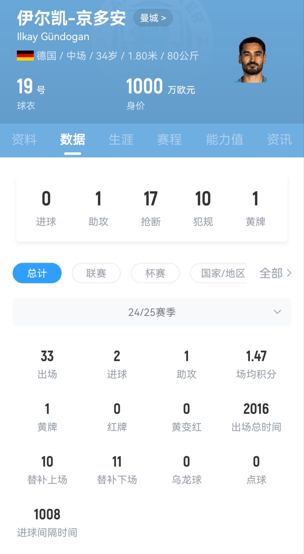 本賽季34歲的京多安代表曼城出戰(zhàn)33場(chǎng)比賽2球1助,曼城戰(zhàn)績(jī)?yōu)?5勝7平11負(fù),勝率僅有45%。