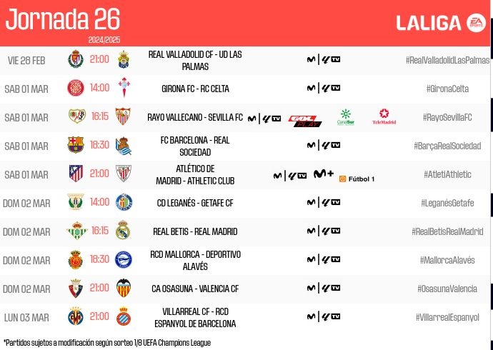 2月14日訊 西甲官方公布了第26輪比賽的開(kāi)球時(shí)間,巴薩vs皇家社會(huì)3月2日1點(diǎn)30分開(kāi)球,貝蒂斯vs皇馬3月2日23點(diǎn)15分開(kāi)球。