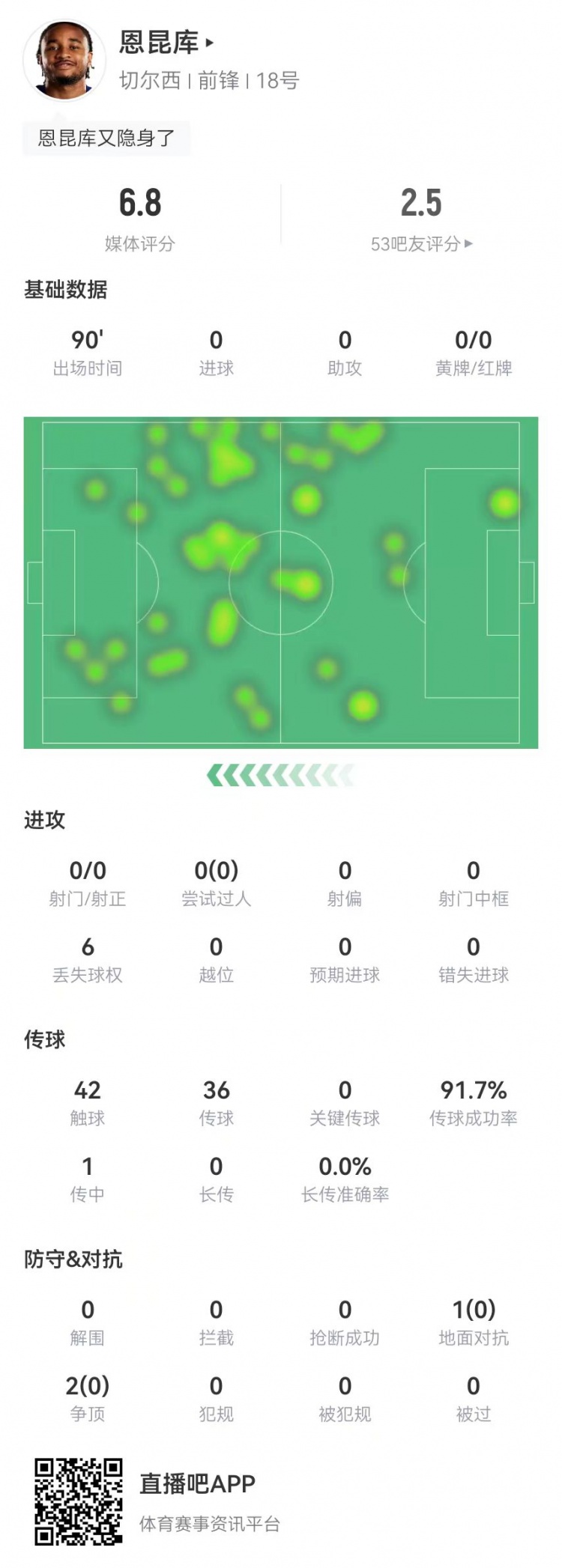 2月15日訊 切爾西在本輪英超0-3不敵布萊頓,恩昆庫本場客串中鋒數(shù)據(jù)如下: