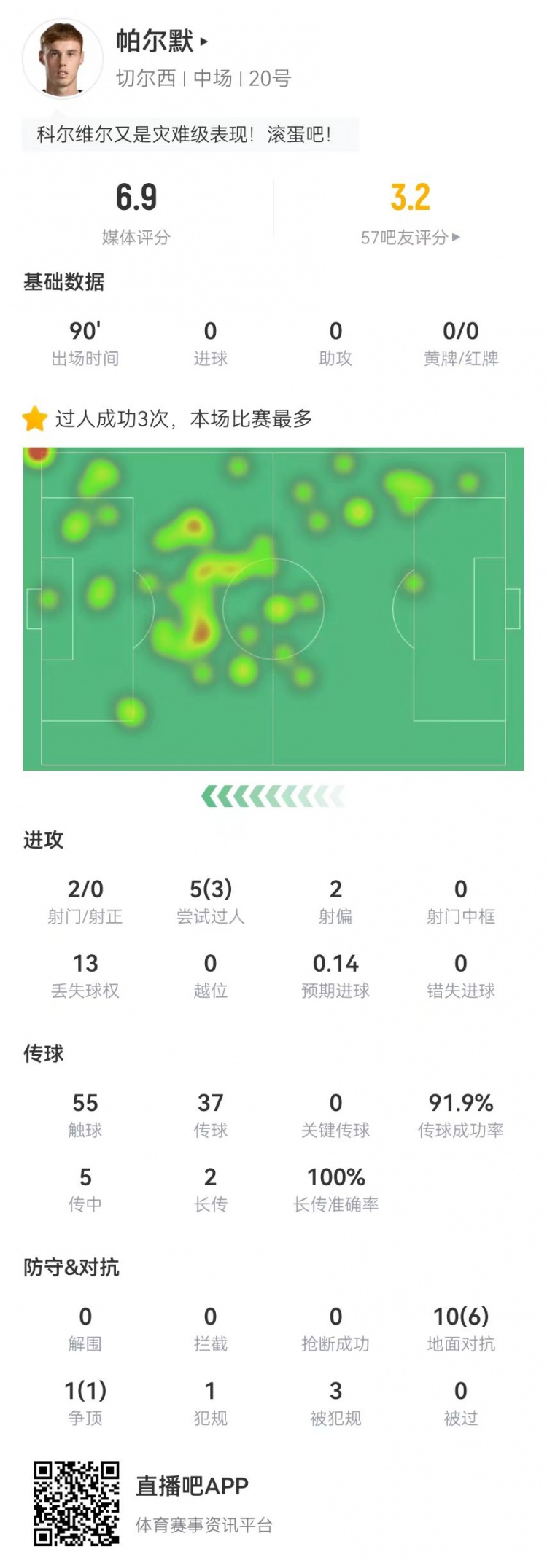 2月15日訊 切爾西在本輪英超0-3不敵布萊頓,帕爾默本場(chǎng)數(shù)據(jù)如下: