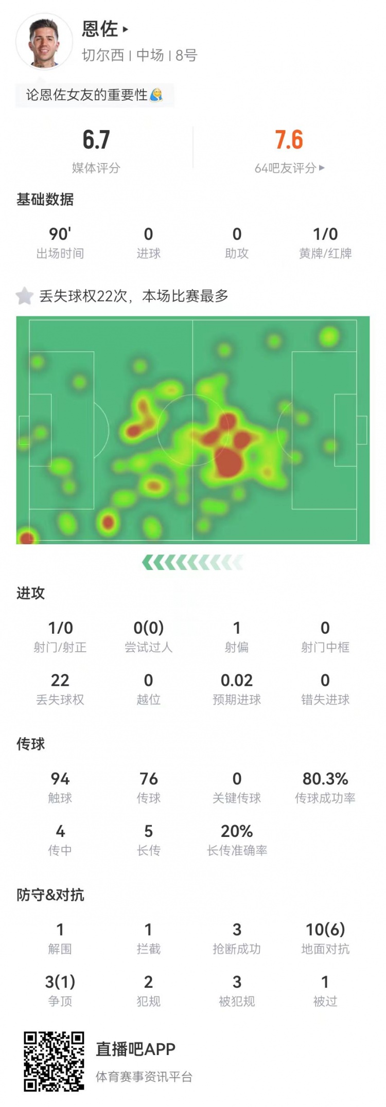 2月15日訊 切爾西本輪英超0-3完敗布萊頓,恩佐本場(chǎng)數(shù)據(jù)如下: