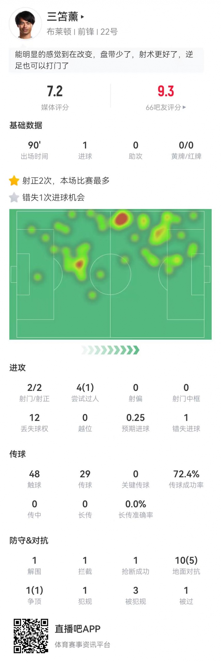 2月15日訊 布萊頓在本輪英超3-0完勝切爾西,三笘薰本場數(shù)據(jù)如下: