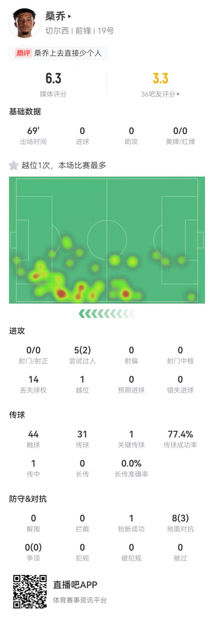 2月15日訊 切爾西在本輪英超0-3慘敗布萊頓,桑喬替補(bǔ)出戰(zhàn)數(shù)據(jù)如下: