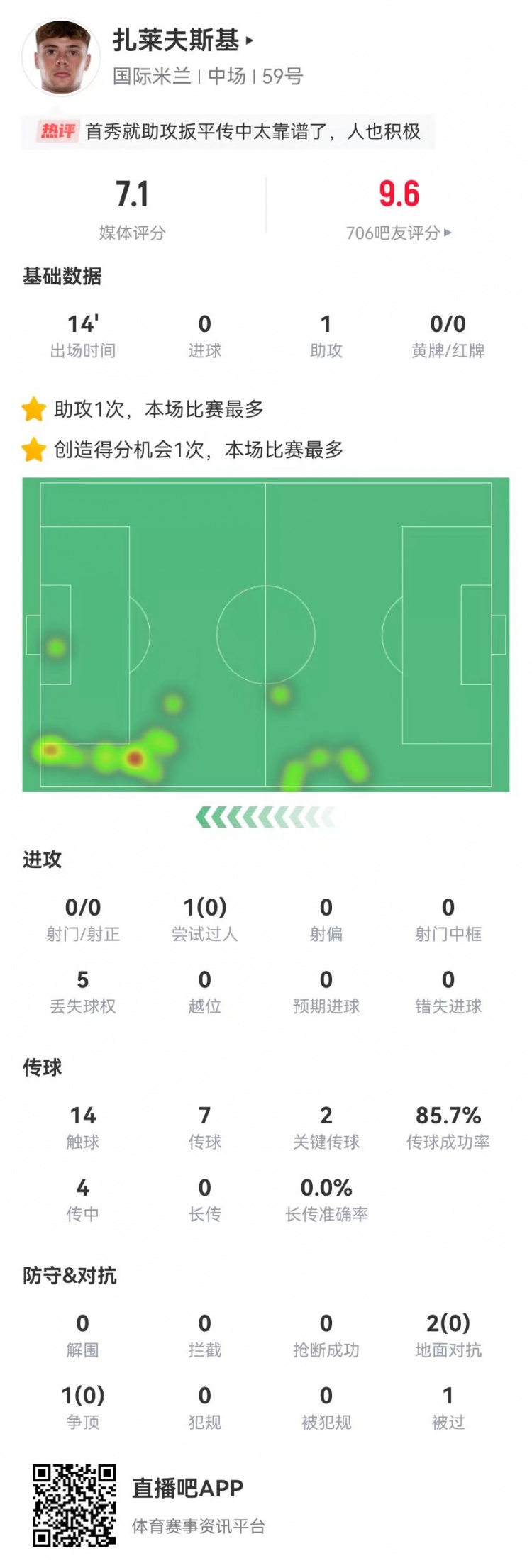 2月3日訊 國米在本輪意甲1-1戰(zhàn)平米蘭,扎萊夫斯基首秀數(shù)據(jù)如下: