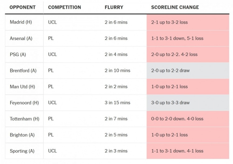 曼城最近9場在10分鐘內(nèi)連丟兩球的比賽統(tǒng)計