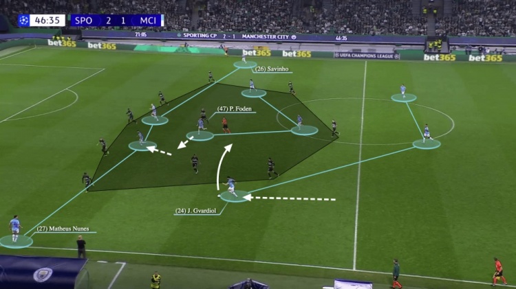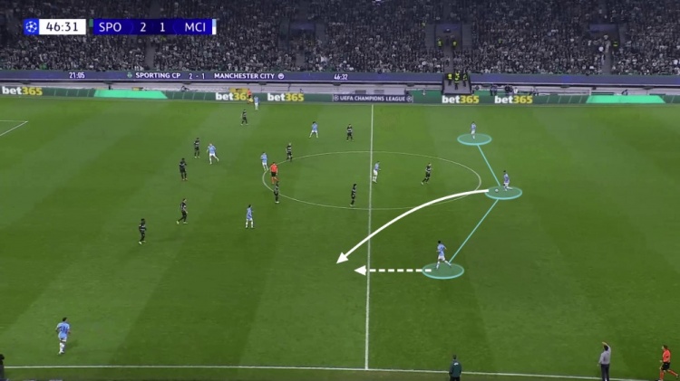 最明顯的例子是對陣葡萄牙體育的比賽。曼城在下半場一開始就失誤了,一個簡單的二過一足以讓貢薩爾維斯從他們的中場身后進(jìn)入。他傳球給邊后衛(wèi)馬克西米利亞諾-阿勞霍,然后皮球越過了埃德森把守的大門。阿勞霍破門后僅86秒,葡萄牙體育就獲得了一個點(diǎn)球。從開球開始,曼城就立即轉(zhuǎn)變?yōu)?-1-3-3陣型來對陣葡萄牙體育的五后衛(wèi)。阿坎吉將球傳給了格瓦迪奧爾,后者在理論上來說是有足夠向前推進(jìn)的空間。