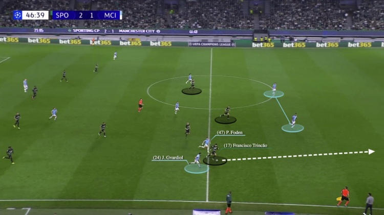 他有三個合理的選擇:傳給馬修斯-努內(nèi)斯,或者將球轉(zhuǎn)移到右路的薩維尼奧,亦或者向后傳遞。但格瓦迪奧爾都沒有選,而是選擇了最困難的路線,傳球給身處重兵集結(jié)區(qū)域的福登,而且他還沒有足夠的傳球精度。葡萄牙體育獲得了球權(quán),立即進(jìn)入了格瓦迪奧爾推進(jìn)留下的空間。