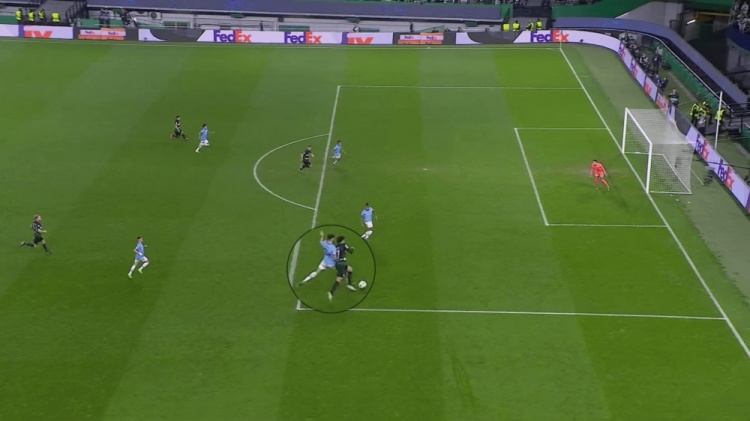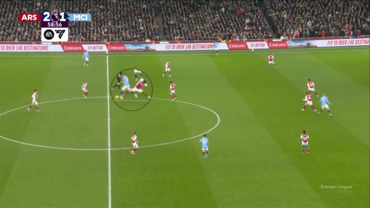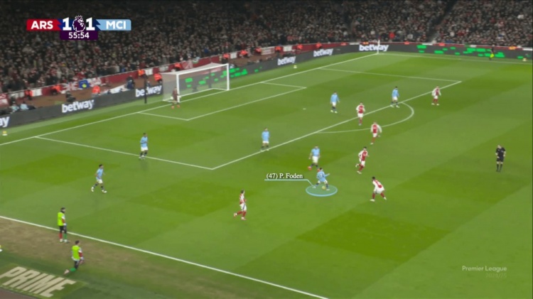 福登、薩維尼奧,再加上曼城的三名中場球員,他們在球門附近有太多的球員,使得他們很難長傳球調(diào)度(哈蘭德在中線附近,沒有出現(xiàn)在這個鏡頭中)。