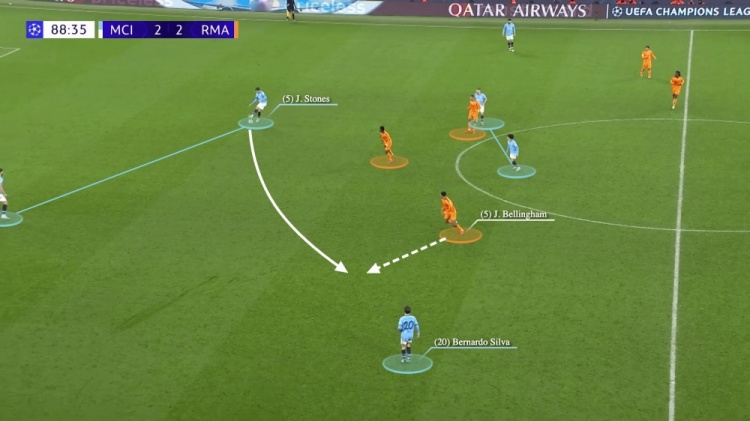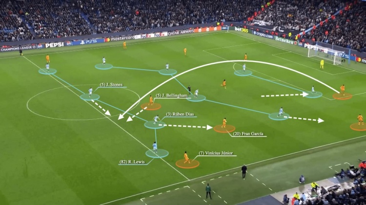 理想情況下,斯通斯和魯本-迪亞斯會形成默契的配合。雖然魯本-迪亞盯著弗蘭-加西亞,并試圖后撤,但斯通斯出現(xiàn)在一個更靠后的位置,使得貝林厄姆并沒有被緊盯,有了一個向前的機(jī)會。
