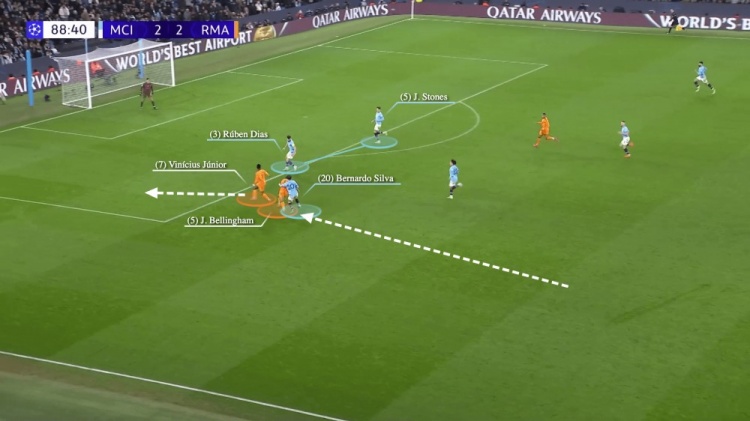 甚至在對陣皇馬的比賽中,此前一直很可靠的斯通斯,也出現(xiàn)了失誤。他在比賽中扮演6號角色,在開局后移動到了左中后衛(wèi)的位置上。他傳球給貝爾納多-席爾瓦,就不是一個合適的選擇。貝林厄姆攔截了這次傳球,并帶球向前推進(jìn),貝爾納多-席爾瓦在禁區(qū)外將其包夾,但這一次并沒有判罰。