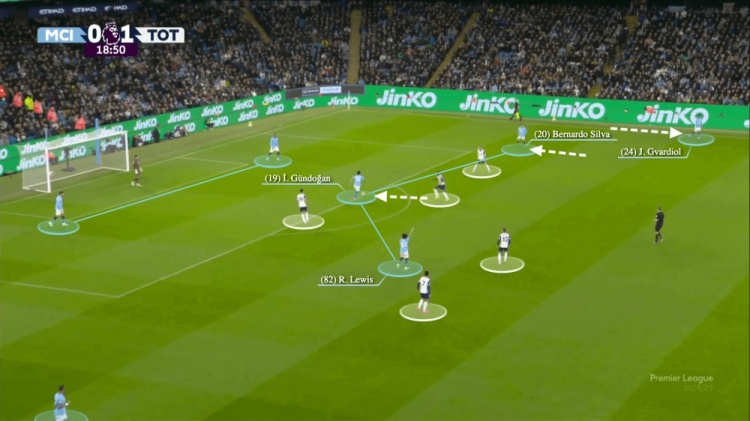 曼城的三名中場球員——里科-劉易斯、貝爾納多-席爾瓦和京多安——都已經(jīng)回收到了禁區(qū)附近,京多安將球帶到了禁區(qū)邊緣。貝爾納多-席爾瓦和格瓦迪奧爾則在邊路活動。