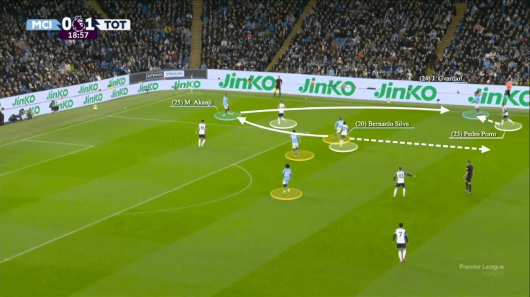 面對熱刺的壓迫,京多安傳球給貝爾納多-席爾瓦,又傳球給阿坎吉。這里的問題是,所有三名中場球員(下圖黃點(diǎn))都靠得太近了,并且都是為球而戰(zhàn)——熱刺只需要兩名球員都能夠防住他們。當(dāng)阿坎吉傳球給格瓦迪奧爾之時,貝爾納多-席爾瓦確實(shí)完成了一次滲透跑動,但曼城的慢速進(jìn)攻讓熱刺鎖定了他們。
