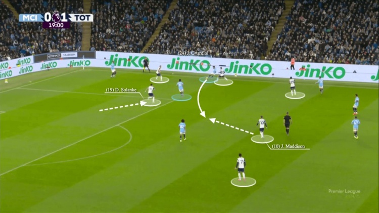 熱刺右后衛(wèi)波羅逼近,格瓦迪奧爾無法傳球給阿坎吉或者埃德森。因此他試圖小角度傳球給京多安。熱刺前鋒索蘭克預(yù)判了格瓦迪奧爾的動作,而格瓦迪奧爾的傳球也出現(xiàn)了失誤——球直接傳給了麥迪遜。