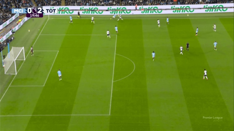 這其中一個復(fù)雜的問題在于右后衛(wèi)凱爾-沃克的位置。他在邊線附近,也沒有出現(xiàn)在上圖之中。這樣的寬度對于曼城這樣的球隊(duì)確實(shí)是非常重要的,但一旦出現(xiàn)失誤,就會給對手留下很大的進(jìn)攻空間。也正是因?yàn)槿绱?,熱刺僅用兩次傳球就制造了一對一的機(jī)會。