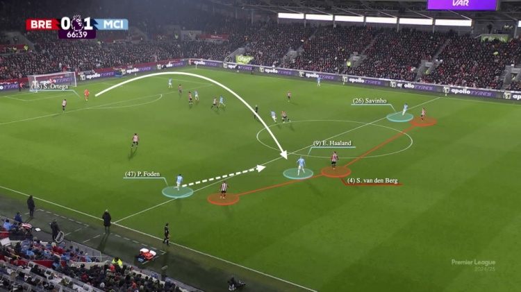 那場比賽的早些時候,面對布倫特福德的人盯人逼搶,哈蘭德扛住了對方防守球員,給了福登和薩維尼奧跑動的空間。