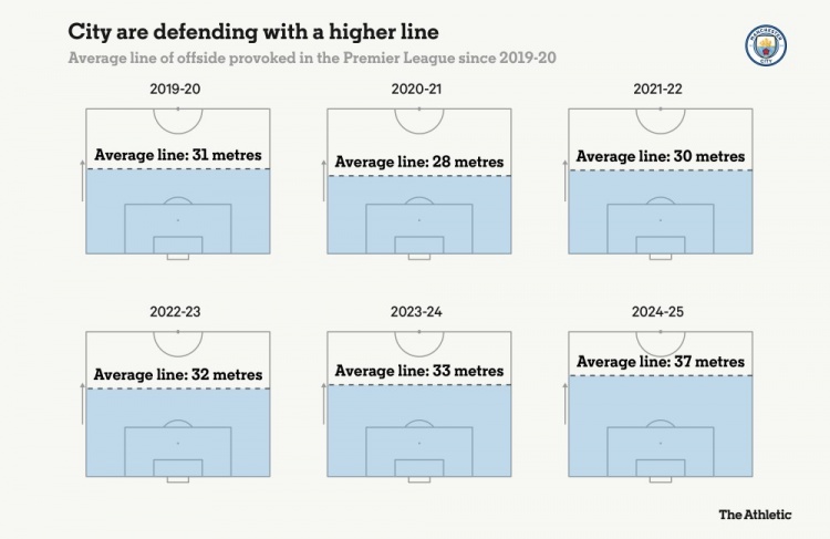 自2019/2020賽季以來,曼城防線高度的變化統(tǒng)計