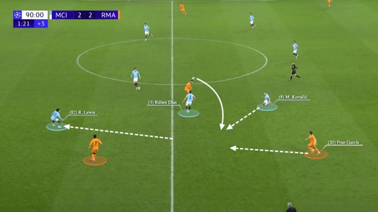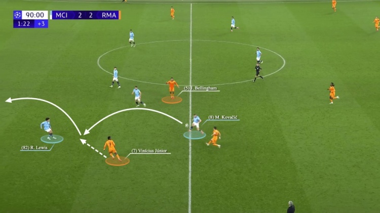 盡管科瓦西奇回過神來,完成了一次搶斷,但獲得球權(quán)之后的他,應(yīng)該將這個球直接送到前場,或者回傳給埃德森。相反,他將球傳給了劉易斯,且傳球并沒有成功。維尼修斯率先得到了球,并突破劉易斯,快速向前推進(jìn)。