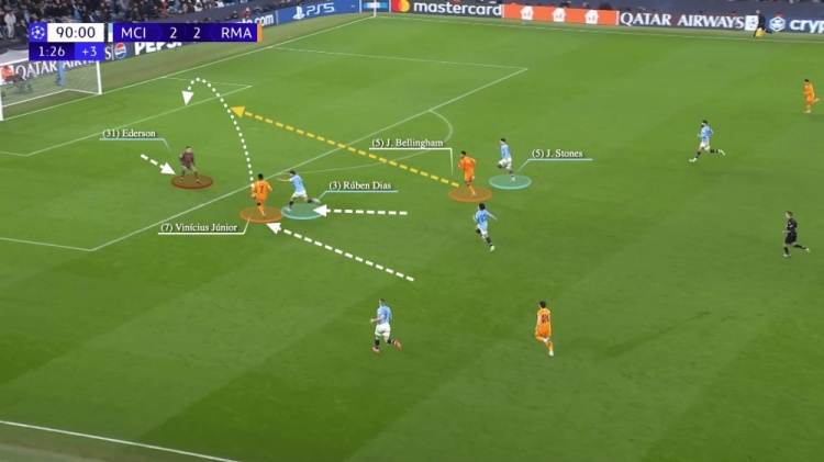 在埃德森出擊的情況下,維尼修斯選擇吊射攻門,不過這球打偏了。不過,貝林厄姆沒有放棄,在球出界之前突破了斯通斯的防守,打空門破門。