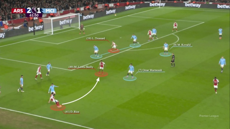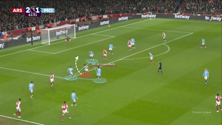10號特林康接球,福登和格瓦迪奧爾都在他的身后。曼城有兩名中后衛(wèi),而阿坎吉也在后撤,因?yàn)樗O(shè)法協(xié)助缺乏對抗經(jīng)驗(yàn)的年輕球員賈馬伊·辛普森-普西,以應(yīng)對約克雷斯。特林康一路帶球到曼城禁區(qū),并沒有受到遭到任何防守威脅。