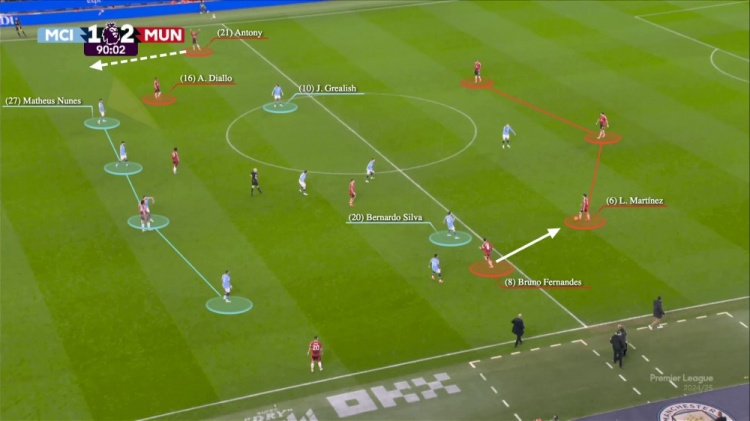 他們在中路的防守很緊湊,但曼聯(lián)并沒有施加什么壓力。替補(bǔ)出場的貝爾納多-席爾瓦不確定是否是向利桑德羅-馬丁內(nèi)斯施壓,還是等待布魯諾-費(fèi)爾南德斯的跑動——后者在邊路游弋。下面這個瞬間,我們能明顯看到哈蘭德希望貝爾納多-席爾瓦能夠施壓。