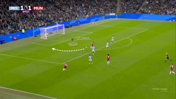 為了應(yīng)對曼聯(lián)的進(jìn)攻,埃德森保持了一個較高的站位,但沒有進(jìn)一步向前采取動作。當(dāng)球進(jìn)入曼城禁區(qū)之后,阿瑪?shù)路磻?yīng)迅速,帶球突破埃德森,小角度完成破門。