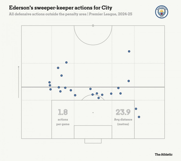 曼城的防守缺陷,使得他們對埃德森的清道夫門將屬性要求更高了。他的場均1.8次撲救和23.9次的場均禁區(qū)外動作,是他自2021/2022賽季意義來最高的,當(dāng)時分別為1.5次和25.3次。