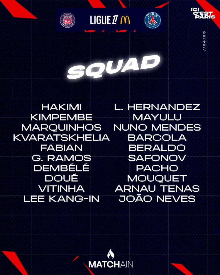 巴黎對陣圖盧茲大名單: