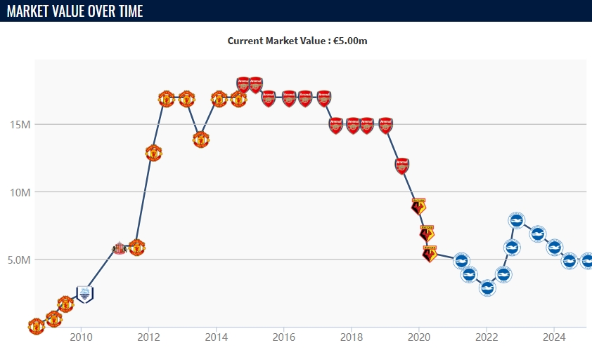 維爾貝克現(xiàn)年34歲,出自曼聯(lián)青訓(xùn),球員在2014年以2000萬(wàn)歐元轉(zhuǎn)會(huì)費(fèi)轉(zhuǎn)投阿森納。維爾貝克在2019年自由身轉(zhuǎn)會(huì)至沃特福德后,布萊頓于2020年10月將其簽下,并效力至今。本賽季這位英格蘭前鋒代表球隊(duì)英超出場(chǎng)19次,打進(jìn)6球并有4次助攻。目前球員德轉(zhuǎn)身價(jià)為500萬(wàn)歐元。