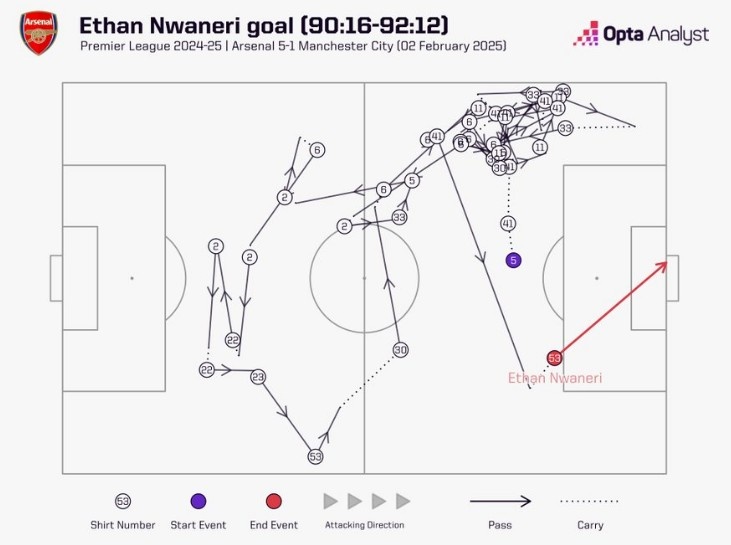 本場(chǎng)比賽恩瓦內(nèi)里打進(jìn)精彩進(jìn)球,據(jù)統(tǒng)計(jì),恩瓦內(nèi)里這粒進(jìn)球前經(jīng)過(guò)36次不間斷傳球,阿森納持續(xù)控球1分54秒,并且除門(mén)將外全員都經(jīng)過(guò)傳球。這也是自2023年9月以來(lái)英超進(jìn)球前最長(zhǎng)不間斷傳球間隔。