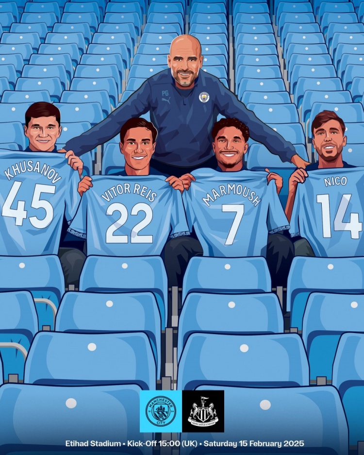 曼城官方發(fā)布了為此役制作的海報,主帥瓜迪奧拉帶領(lǐng)胡桑諾夫、雷斯、馬爾穆什、尼科-岡薩雷斯四位新援的漫畫形象出鏡。