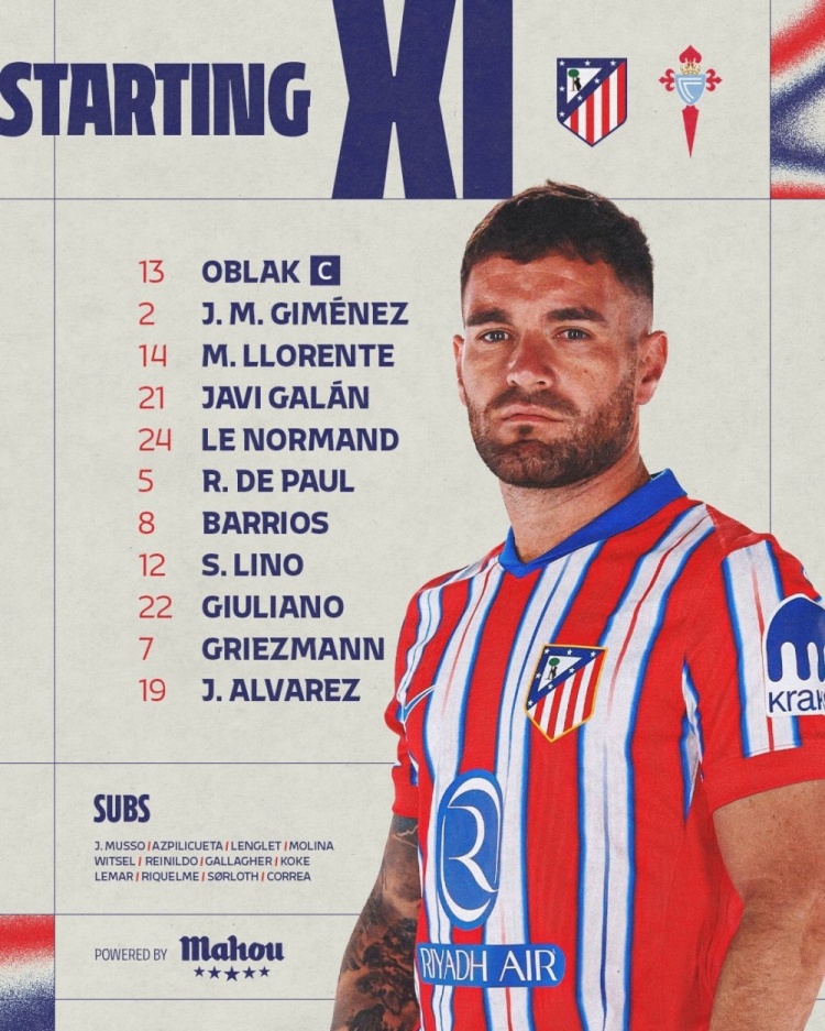 馬競(jìng)對(duì)陣塞爾塔首發(fā):阿爾瓦雷斯、格列茲曼領(lǐng)銜,小西蒙尼出戰(zhàn)