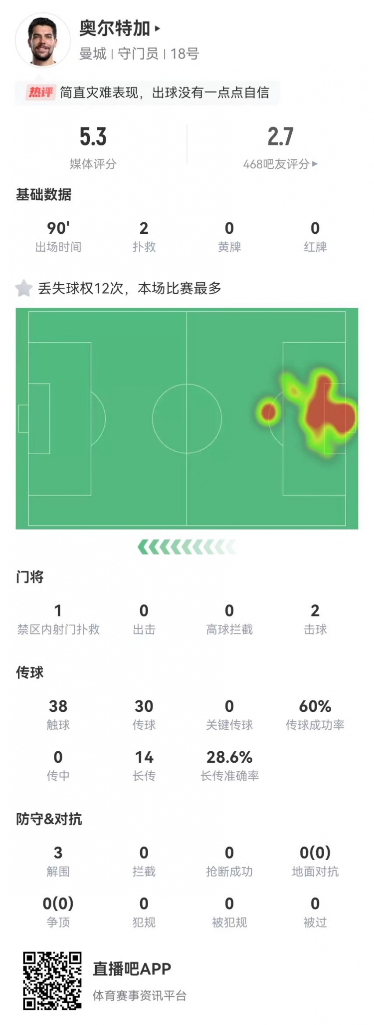 2月3日訊 曼城在本輪英超1-5慘敗阿森納,奧爾特加本場數(shù)據(jù)如下: