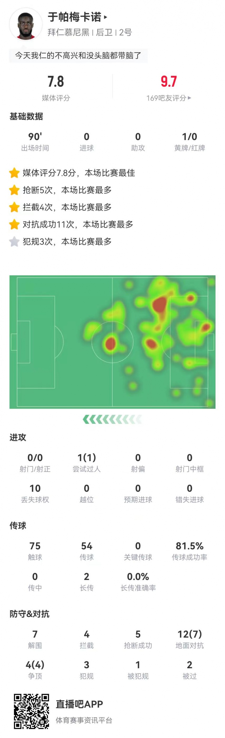 2月16日訊 拜仁在本輪德甲0-0逼平勒沃庫(kù)森,于帕梅卡諾本場(chǎng)數(shù)據(jù)如下: